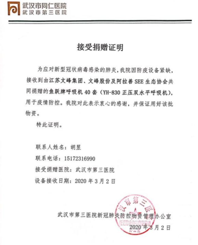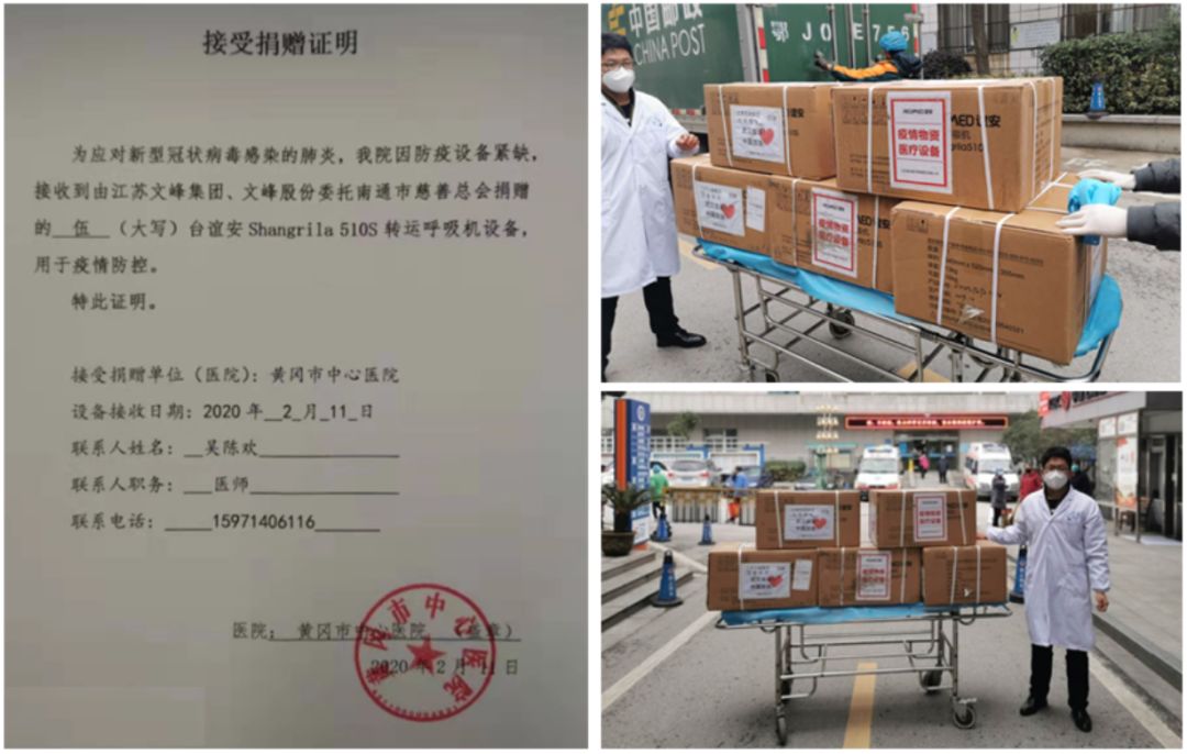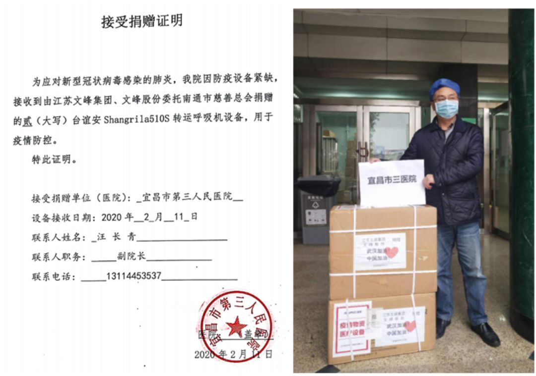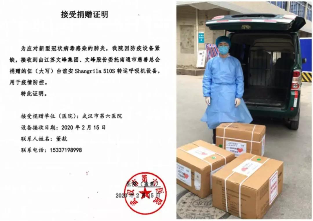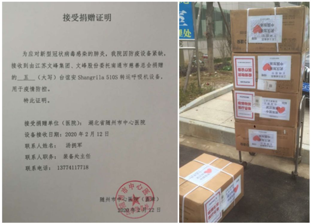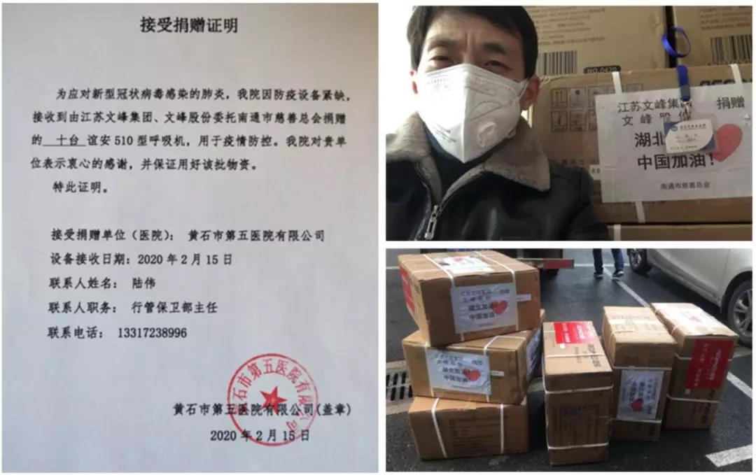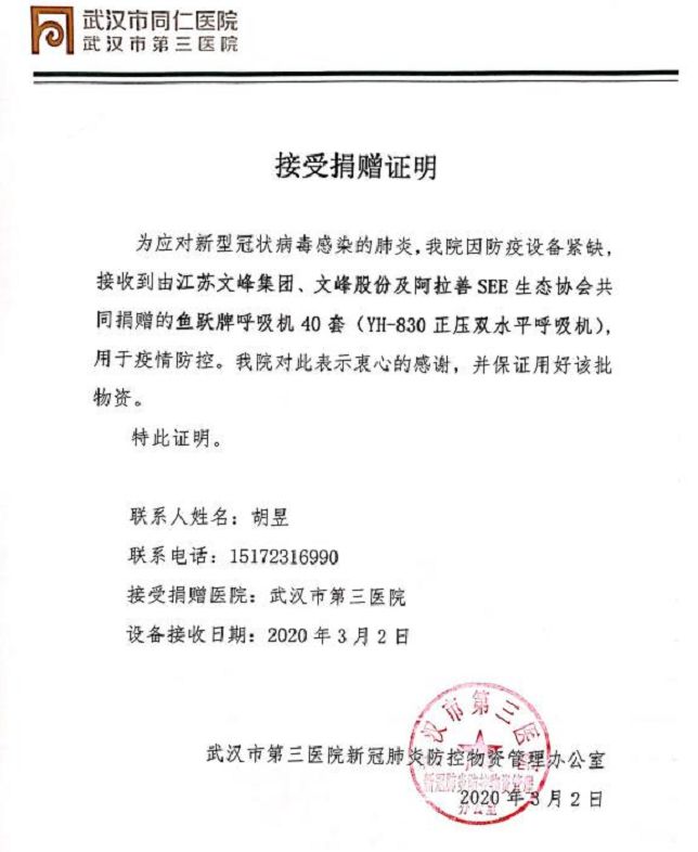 文峰集團(tuán)攜手阿拉善SEE生態(tài)協(xié)會(huì),共同捐助給武漢市第三醫(yī)院魚躍牌雙水平醫(yī)用專業(yè)呼吸機(jī)40臺(tái),用于支援火神山醫(yī)院建設(shè)。