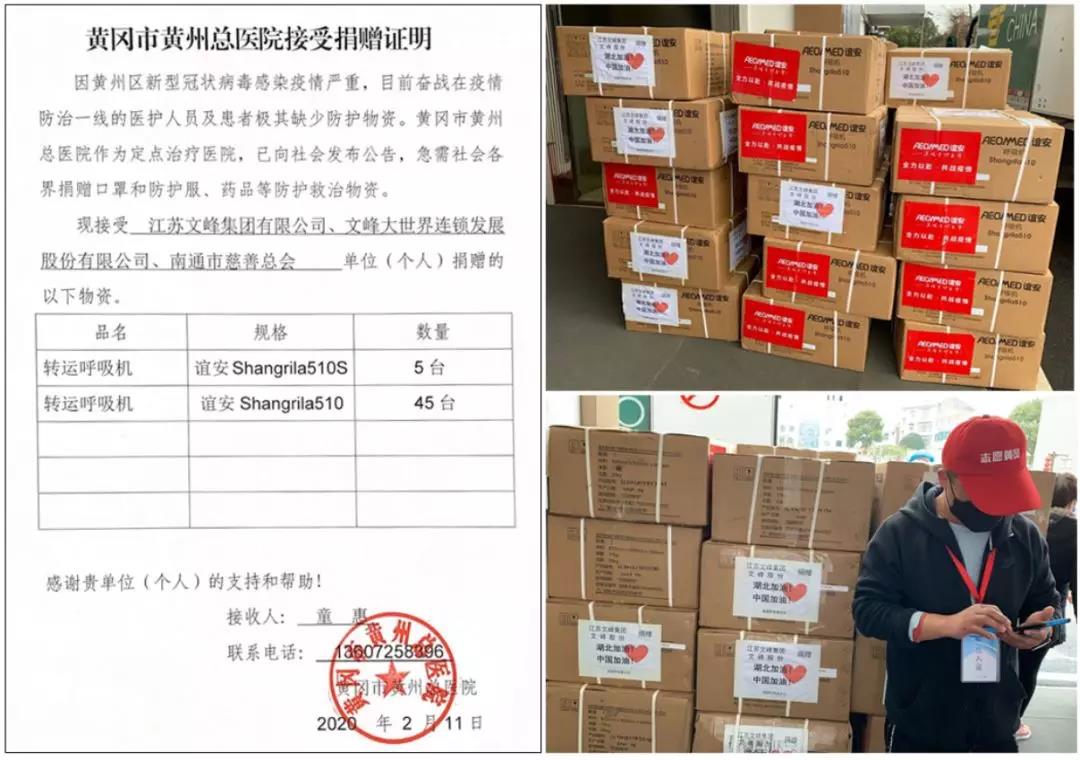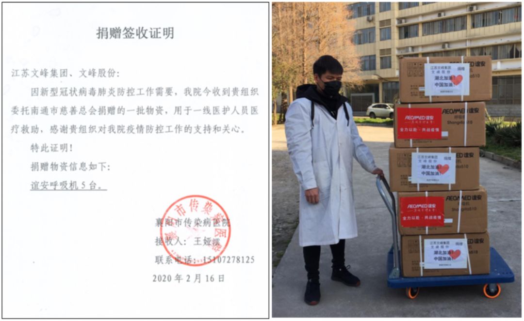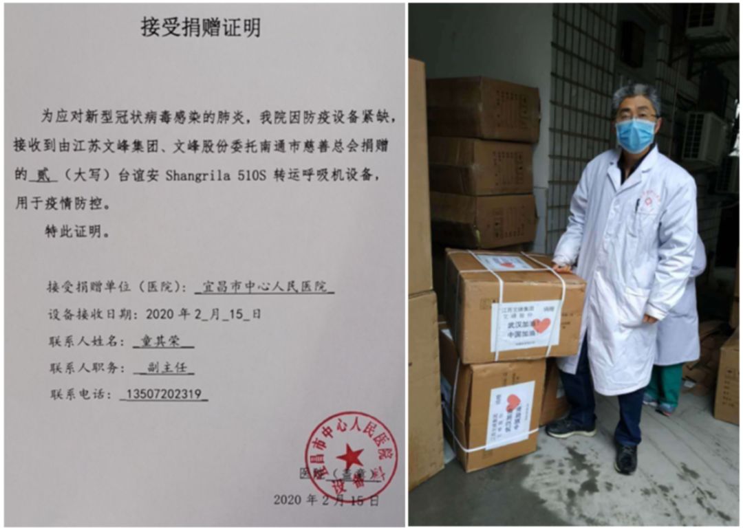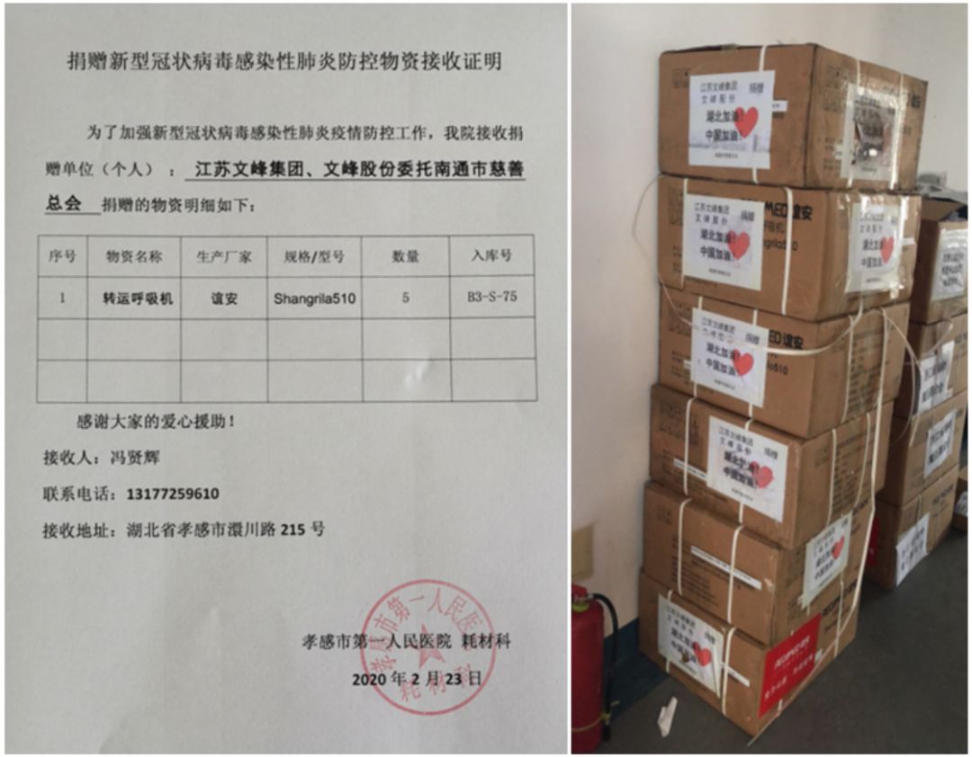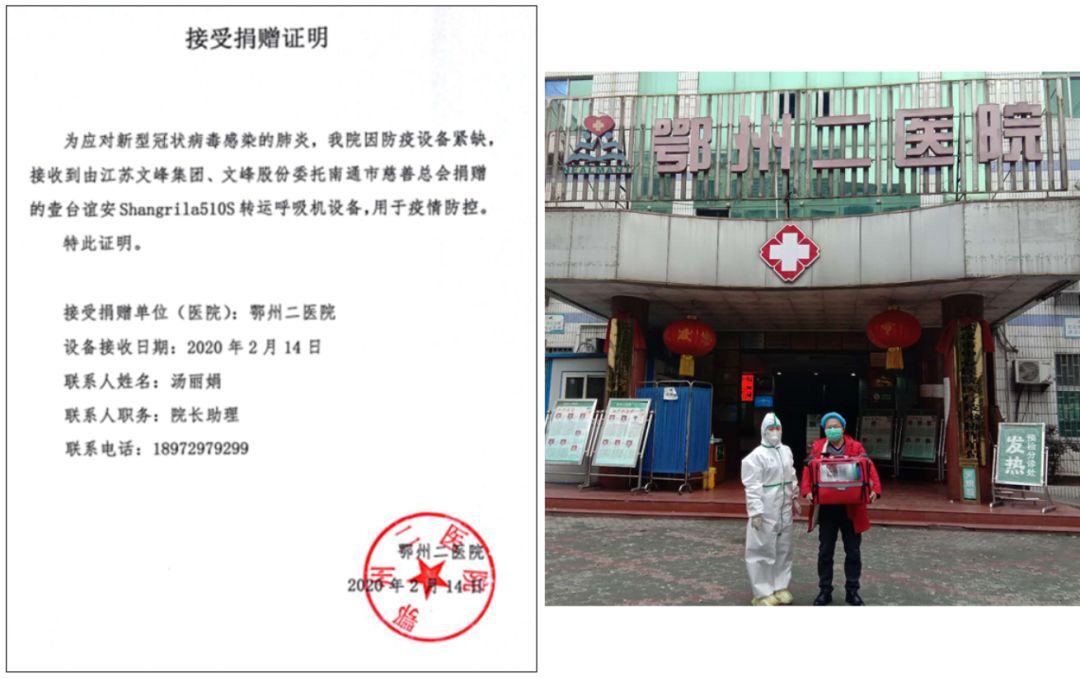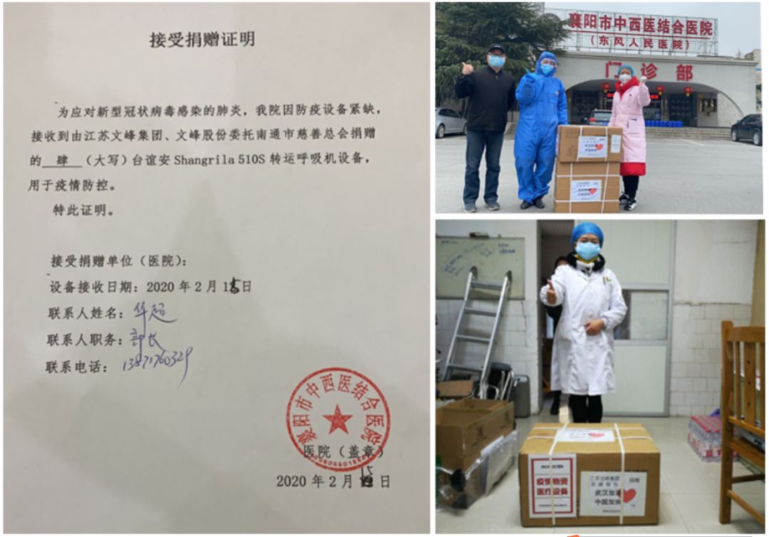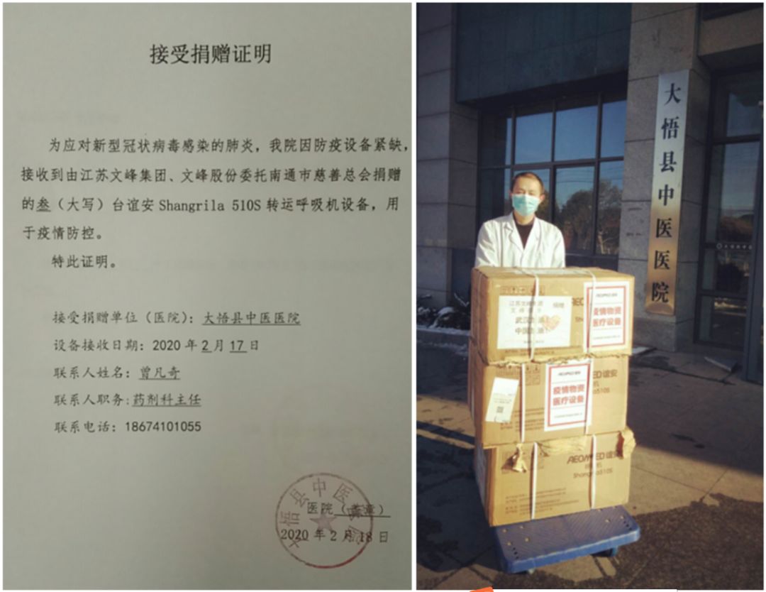 文峰集團(tuán)攜手阿拉善SEE生態(tài)協(xié)會(huì),共同捐助給武漢市第三醫(yī)院魚躍牌雙水平醫(yī)用專業(yè)呼吸機(jī)40臺(tái),用于支援火神山醫(yī)院建設(shè)。