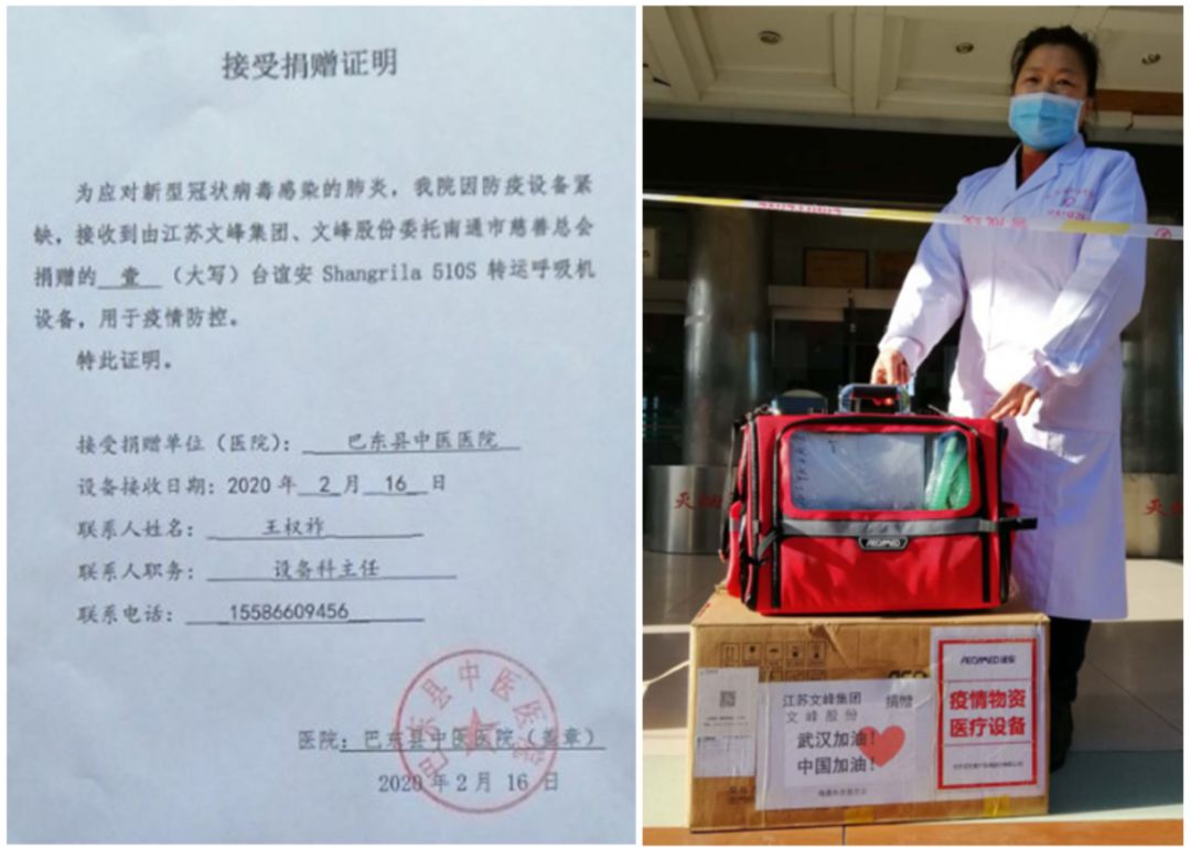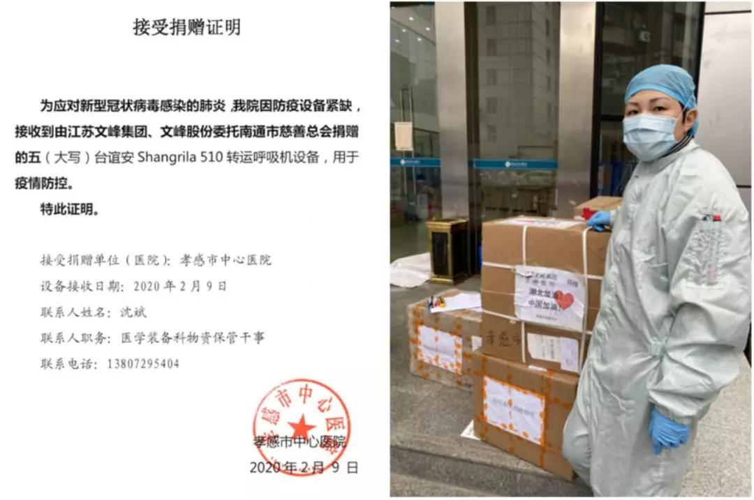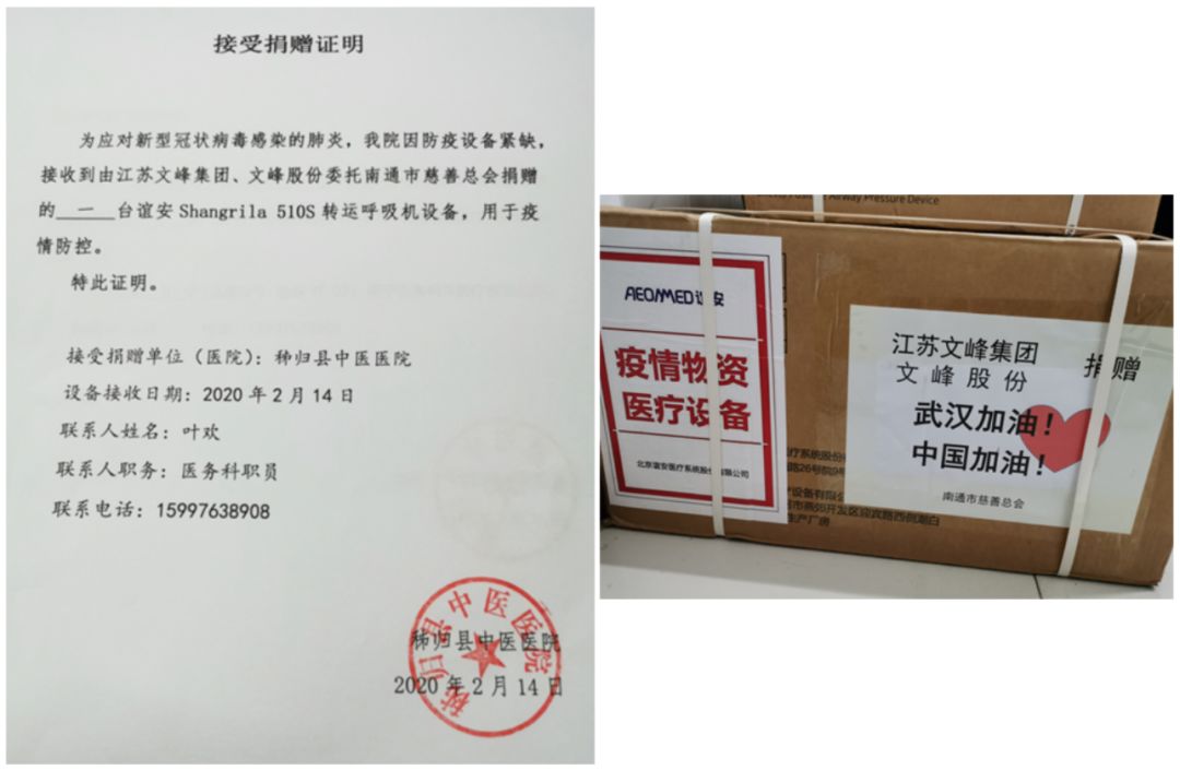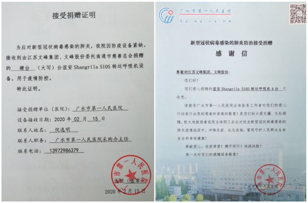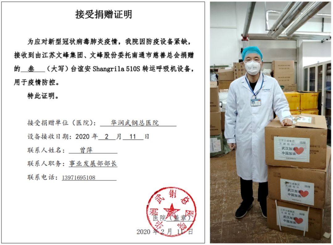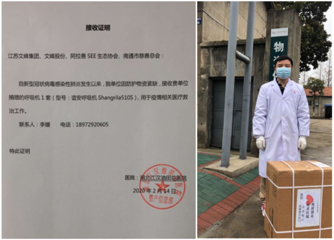 文峰集團(tuán)攜手阿拉善SEE生態(tài)協(xié)會(huì),共同捐助給武漢市第三醫(yī)院魚躍牌雙水平醫(yī)用專業(yè)呼吸機(jī)40臺(tái),用于支援火神山醫(yī)院建設(shè)。