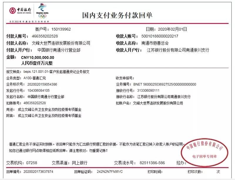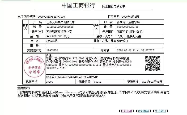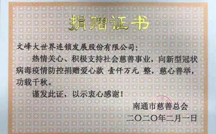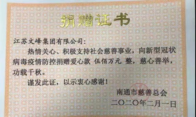 文峰集團(tuán)、文峰股份各捐資1000萬(wàn)元,設(shè)立疫情專項(xiàng)基金,與所贈(zèng)慈善總會(huì)共同審批資金使用,確保各項(xiàng)資金都用到實(shí)處。2月1日上午,2000萬(wàn)元已匯出。