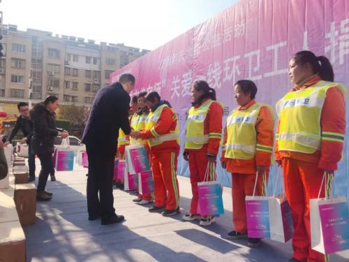 在隨后的捐贈儀式上,如皋市城管局和文峰大世界如皋店的領(lǐng)導(dǎo)共同為環(huán)衛(wèi)工人們送上了慰問禮品。