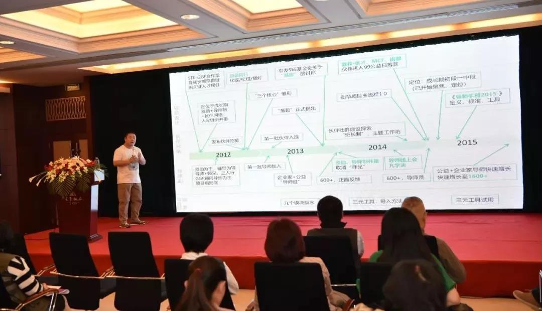 阿拉善SEE基金會(huì)行業(yè)組高級項(xiàng)目經(jīng)理王亦慶將勁草同行七年的發(fā)展概括為兩個(gè)階段。2012~2015年屬于第一階段,在這一階段,項(xiàng)目提出了資助、導(dǎo)師制、伙伴網(wǎng)絡(luò)三大核心,確定了勁草1.0版本的服務(wù)體系;2016~2019年屬于第二階段,在這一階段勁草同行發(fā)生很多變化,并逐漸形成一套特有的產(chǎn)品與服務(wù)。