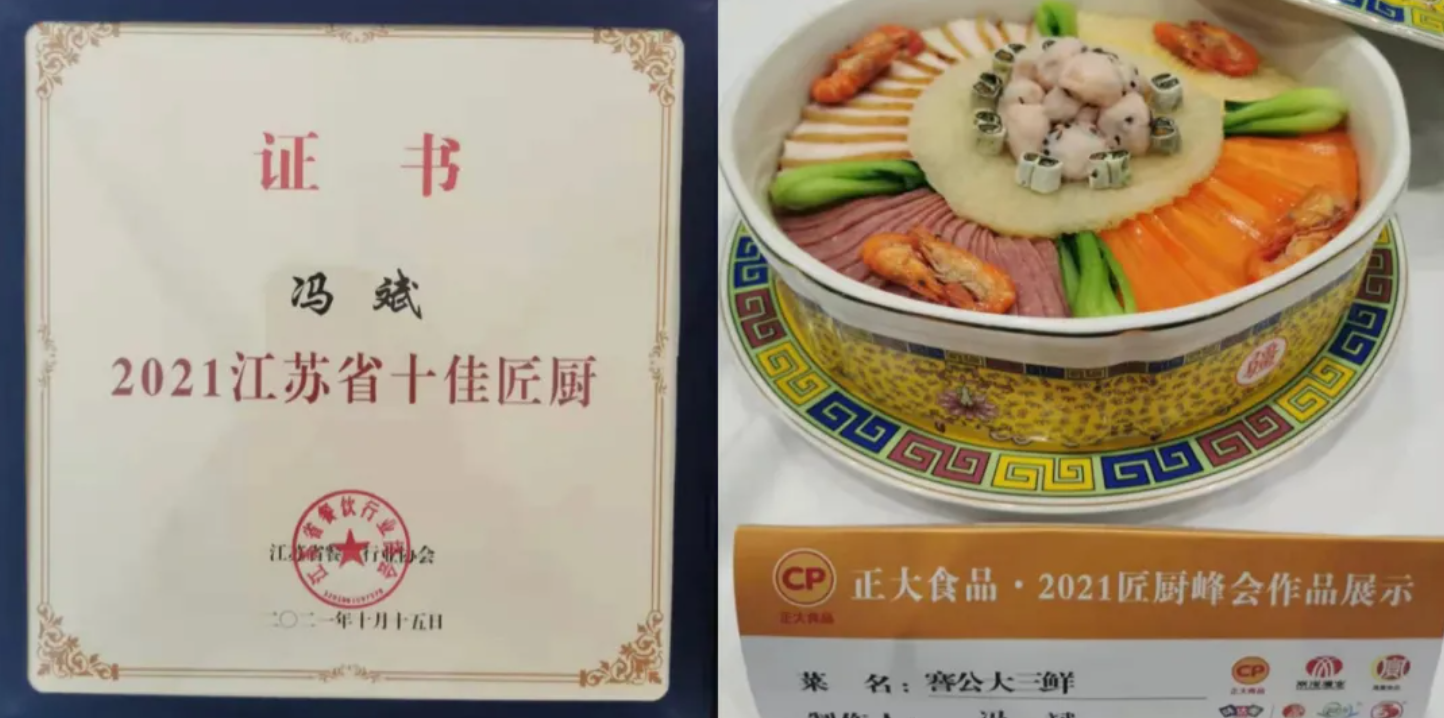 2021 年 10 月 15 日至 17 日,以“綠色餐飲、消費(fèi)促進(jìn)”為主題的2021第十一屆江蘇國(guó)際餐飲博覽會(huì)在南京國(guó)際展覽中心舉辦。南通大飯店行政總廚馮斌在活動(dòng)中獲得了江蘇省“十佳匠廚”榮譽(yù)稱(chēng)號(hào)。