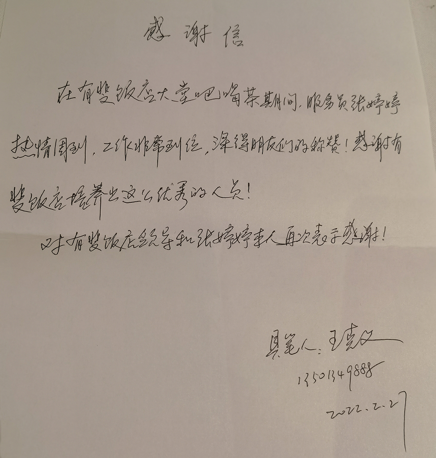 近日,南通新有斐大酒店收到了顧客王先生的感謝信,信中表示:他在南通新有斐大酒店消費(fèi)期間,酒店的服務(wù)員張婷婷對他的服務(wù)熱情周到,工作非常到位,想要通過表揚(yáng)信感謝張婷婷周到的服務(wù),也感謝南通新有斐大酒店培養(yǎng)出了這么優(yōu)秀的員工。