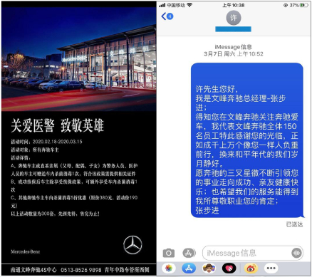 疫情并沒有阻隔我們向英雄致敬,在全國(guó)疫情緊張的情況下,南通當(dāng)?shù)蒯t(yī)療救援隊(duì)也支援了武漢。為致敬英雄,南通文峰奔馳店對(duì)所有醫(yī)護(hù)人員、警務(wù)人員車主提供了免費(fèi)車內(nèi)殺菌消毒服務(wù),奔馳店負(fù)責(zé)人還向英雄們發(fā)送了致敬關(guān)愛短信。